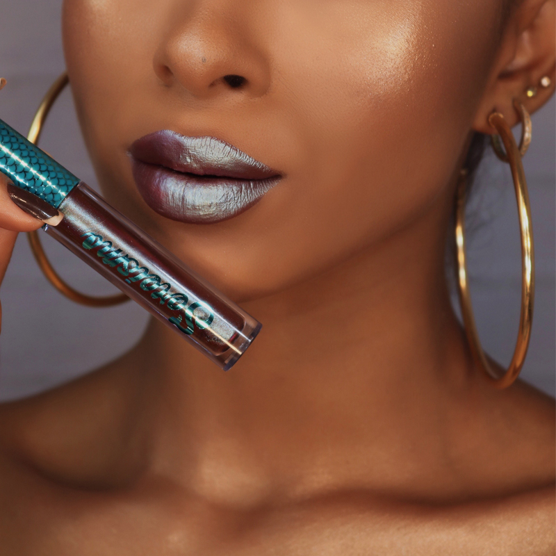 Sirenusa é um ótimo exemplo de cor curinga. Nos meus lábios, essa Cauda de Sereia entrega um fundinho marrom com reflexos azulados. Porém, na boca da Thamy é praticamente um azul prateado. Incrível, né?