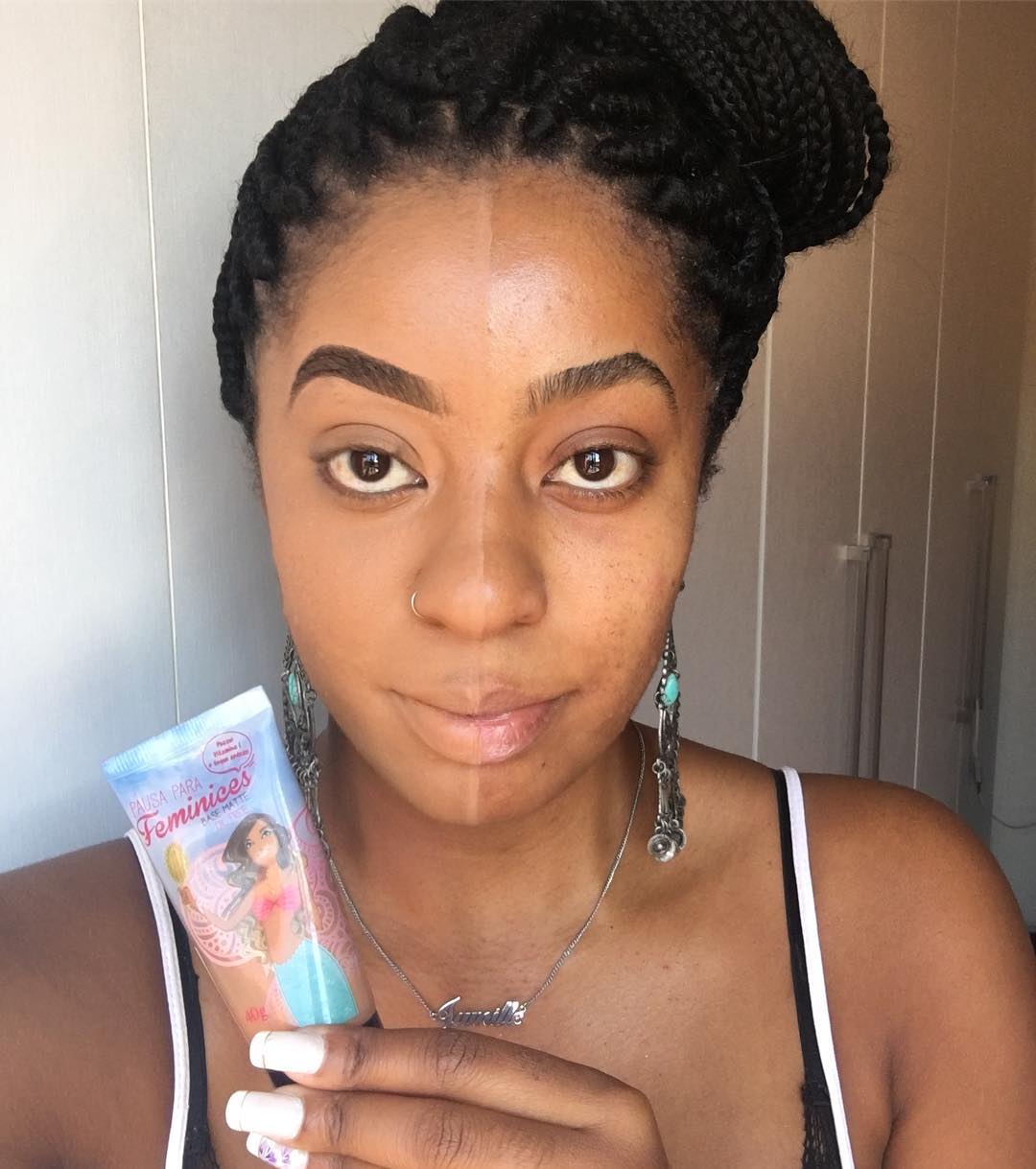 Entre a 7 e a 8 existia um pulo muito grande de nuance, por isso a 7,5. Pesquisamos MUITO pra chegar nesse tom de pele negra com fundo amarelado meio oliva, é bem comum e creio que atenda muitas pessoas. Conversei com a Gabi de Pretas pra essa cor.