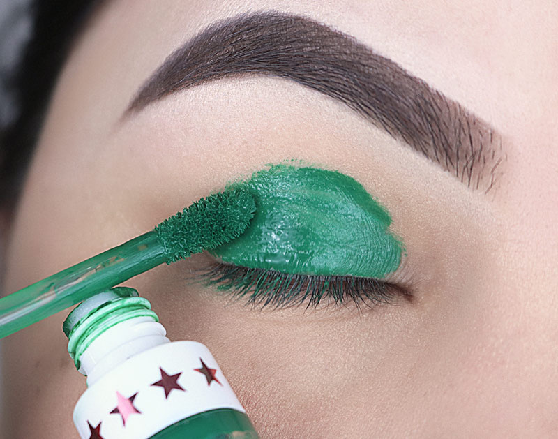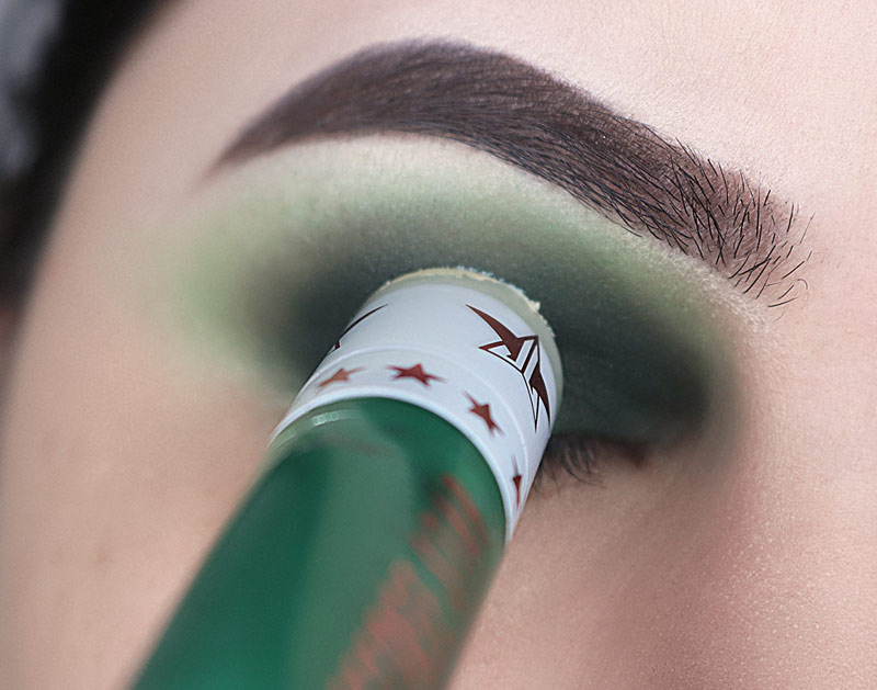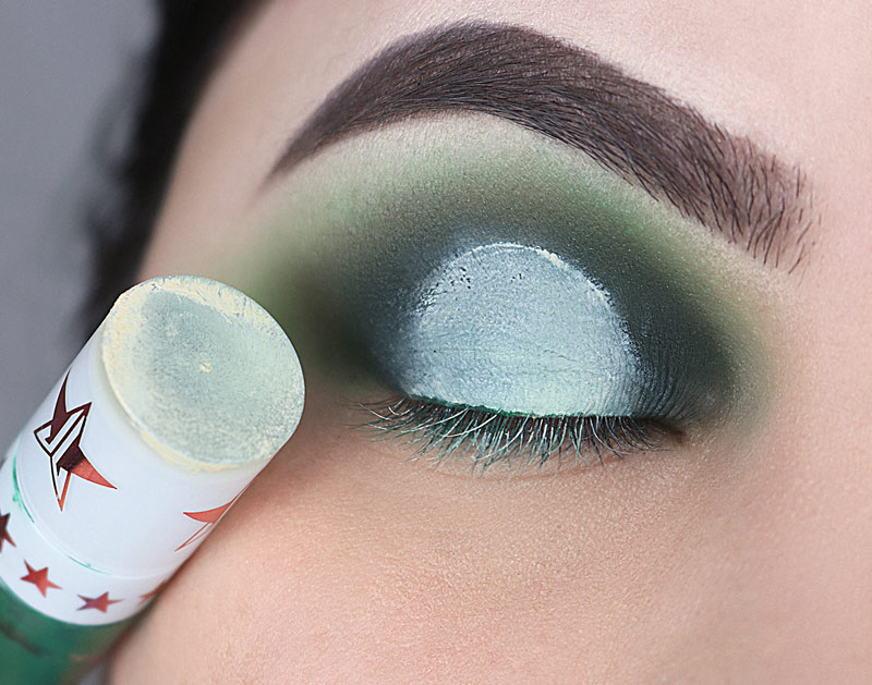 Na sequência pego um batom verde – Mistletoe do Jeffree Star – e aplico em toda a pálpebra. Eu não encontrei nenhuma sombra verde desse tom (acredita?) por isso fui de batom mesmo.