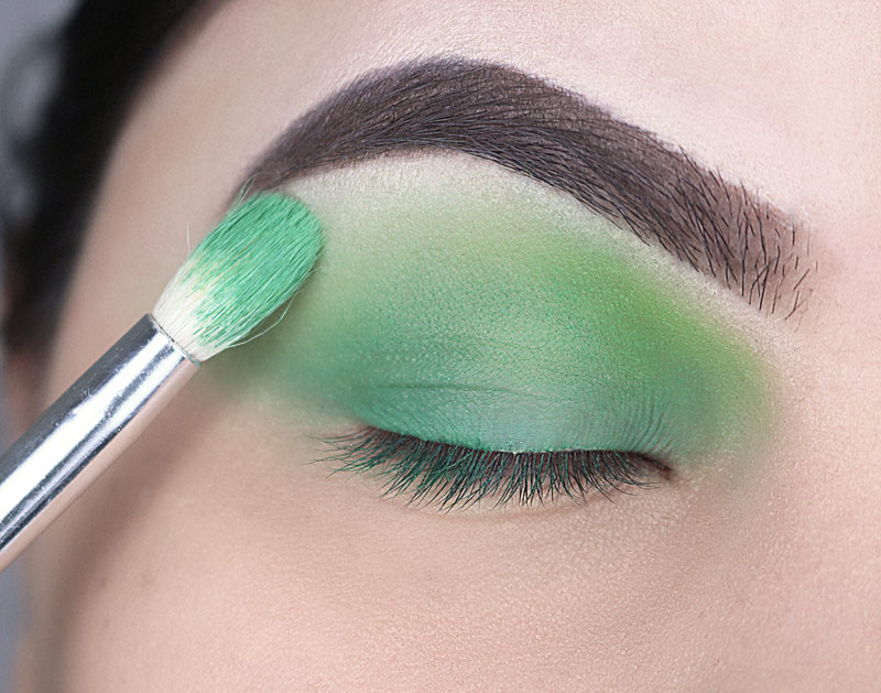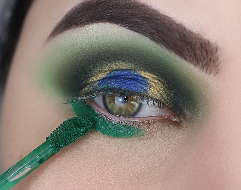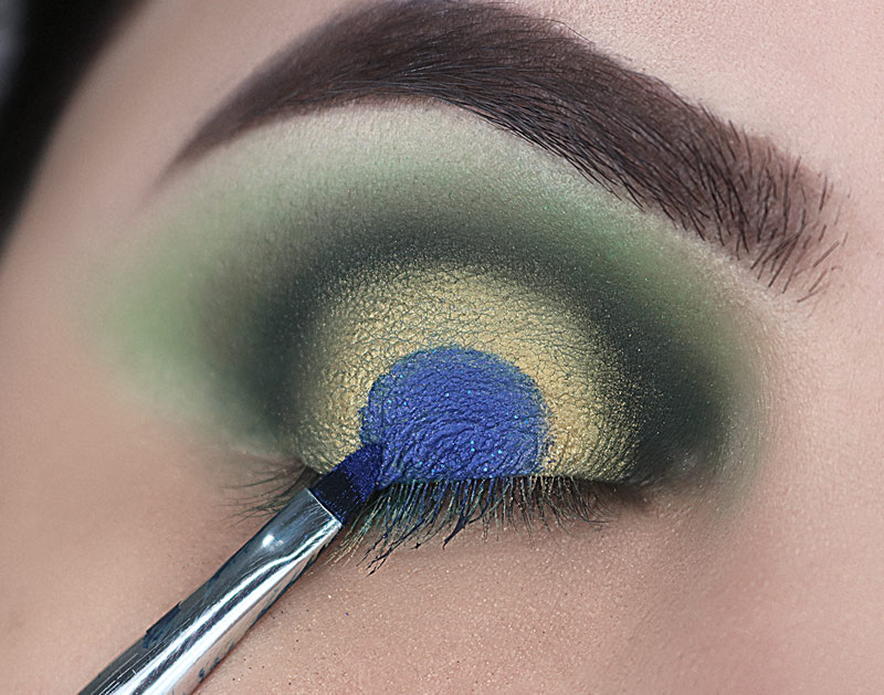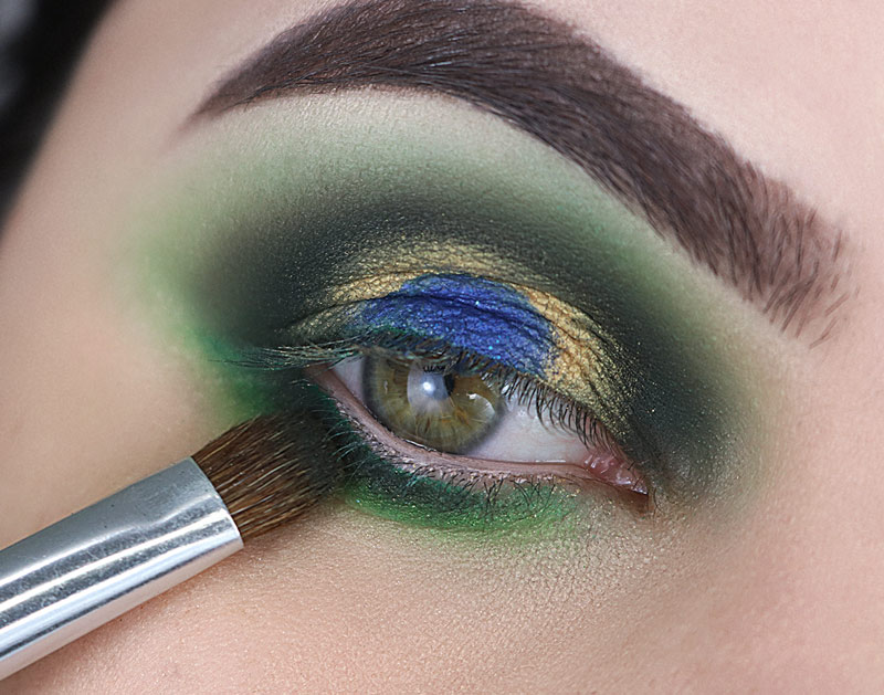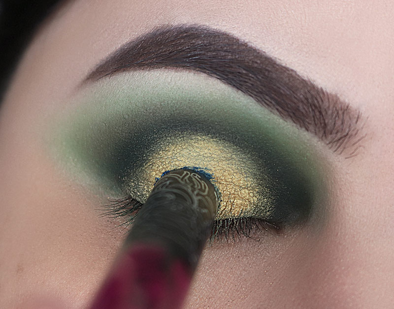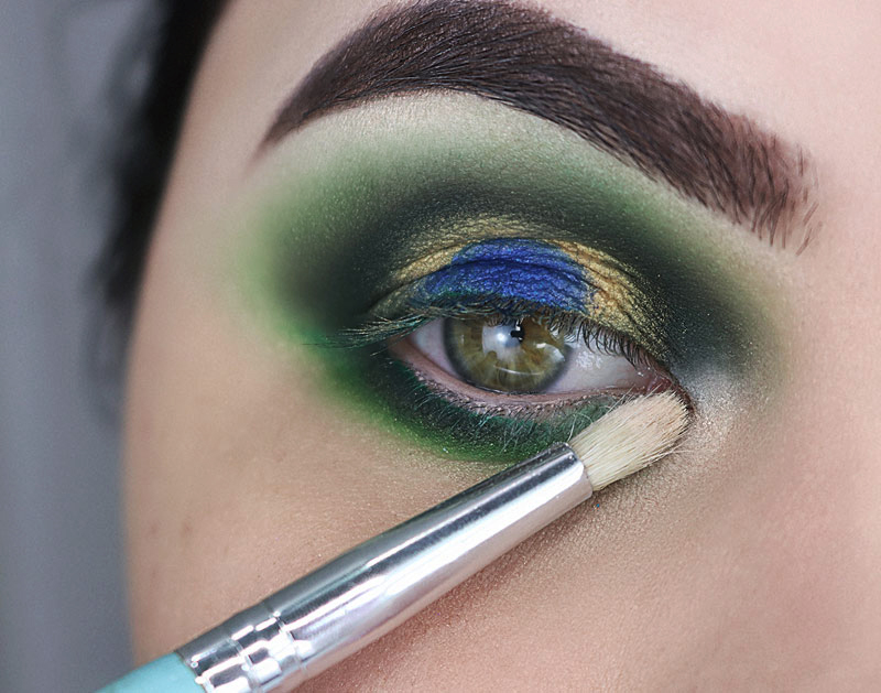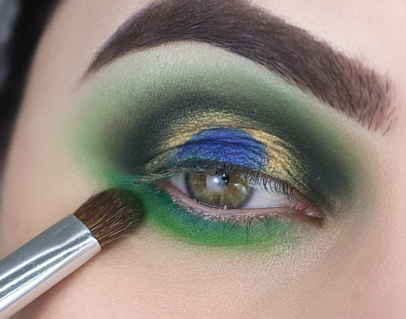 ...e esfumo em todo o contorno do globo ocular exatamente onde afunda o pincel, do canto interno até o externo. Mantendo esse verde escuro dentro do verde mais claro. Cuide para as transições ficarem bem bonitas, se necessário volte para o pincel fofinho que tem aquele ”resto” de batom verde nas cerdas e esfume o encontro das cores para deixar tudo misturado.