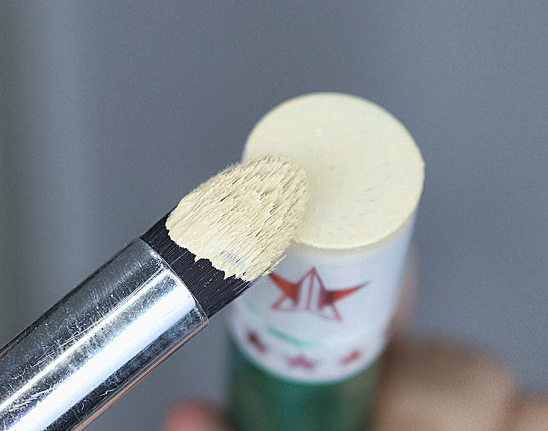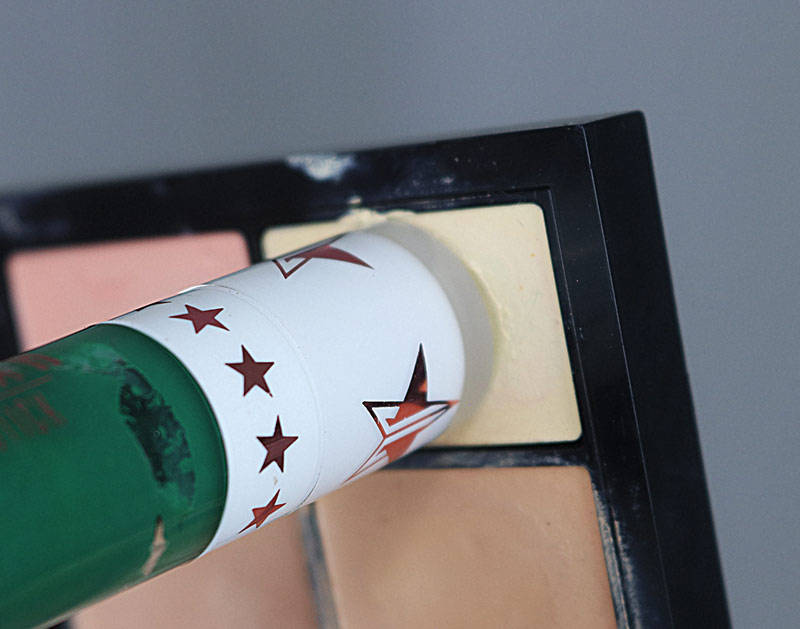 Agora vem a parte legal e criativa! Uso o batom do Jeffree como carimbo para criar a parte amarela da make, coloco corretivo amarelo na tampa e carimbo bem no centro dos olhos. Assim: